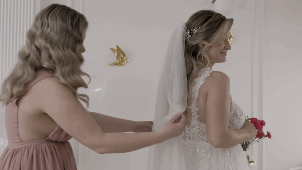 Po przygotowaniach u Pana Młodego przenieśliśmy się do Pani Młodej, gdzie atmosfera była równie magiczna. Razem ze świadkową czekały już na nas gotowe, by uchwycić piękne chwile. Szampan, piękny wystrój domu i subtelne detale stworzyły cudowną scenerię, która idealnie wpasowała się w klimat dnia.