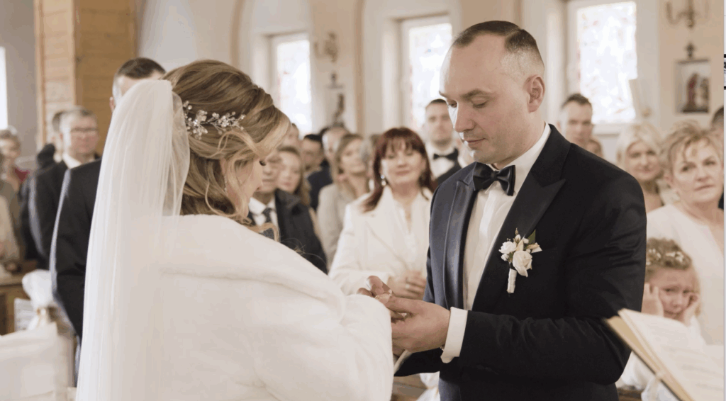 Kiedy Pan Młody wrócił, nastąpił moment firstlook – pełen emocji i wzruszeń. Po błogosławieństwie, Państwo Młodzi wsiadli do samochodu i ruszyliśmy do kościoła na Bacieczkach w Białymstoku. Ceremonia była pełna miłości, a kościół wypełniony gośćmi dodawał uroku całemu wydarzeniu.