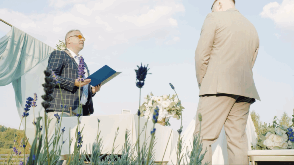 Ceremonia ślubna odbyła się w formie cywilnej ceremonii w plenerze. To miejsce przy Supraślu wprost idealnie pasowało do tej formy ślubu – z pięknym lasem w tle, wspaniałym światłem i dźwiękami zespołu muzycznego grającego na skrzypcach. Reportaż wideo z tego momentu to prawdziwa uczta dla zmysłów – pełna emocji, radości i miłości.